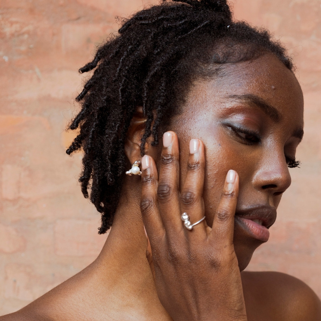 La perla naturale di fiume, racchiusa al centro, è un nucleo vivo, un cuore che custodisce memoria.